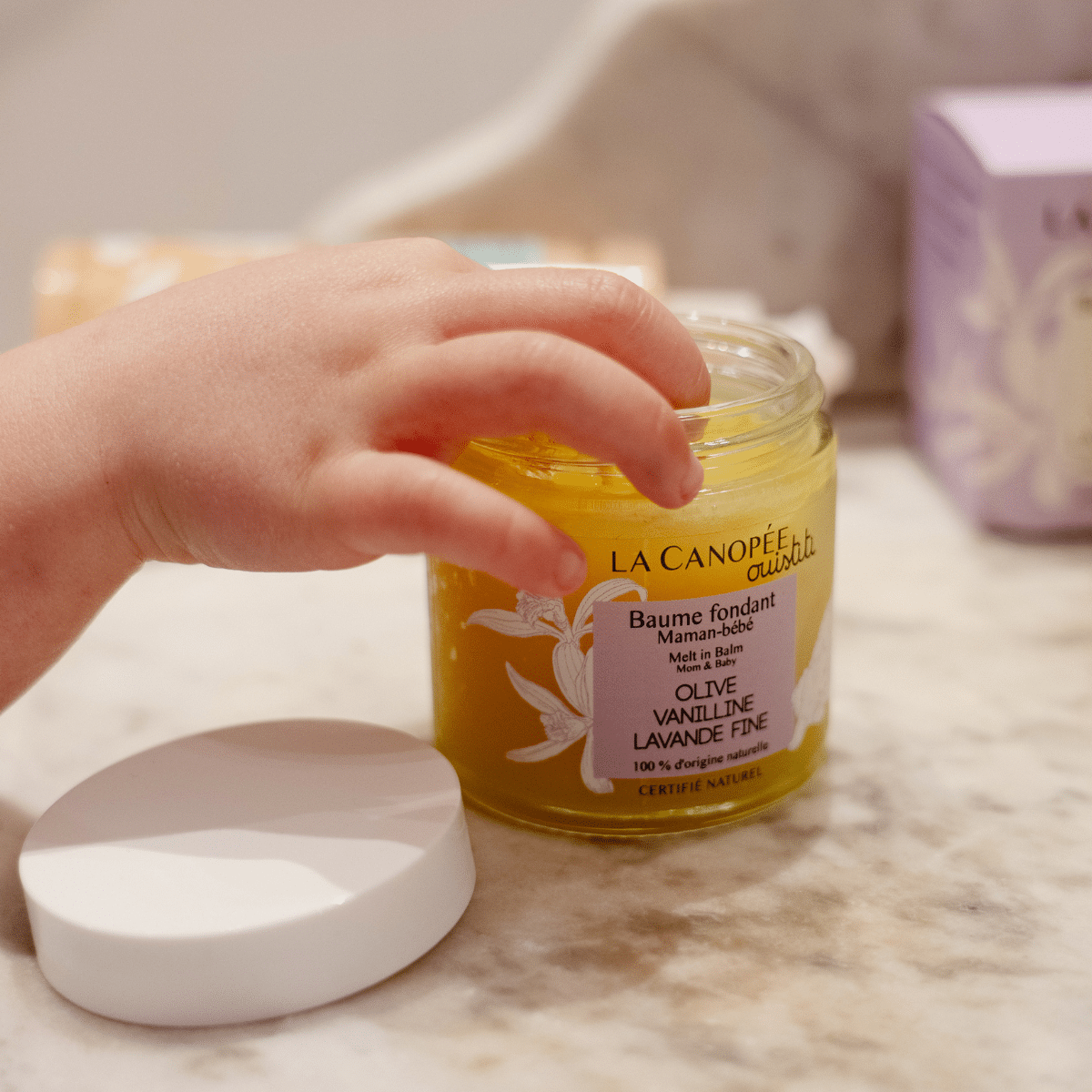Le Baume Fondant Maman Bébé La Canopée est un soin riche et doux nourrissant, apaisant et adoucissant formulé pour protéger la peau sensible des futures mamans et des tout-petits.