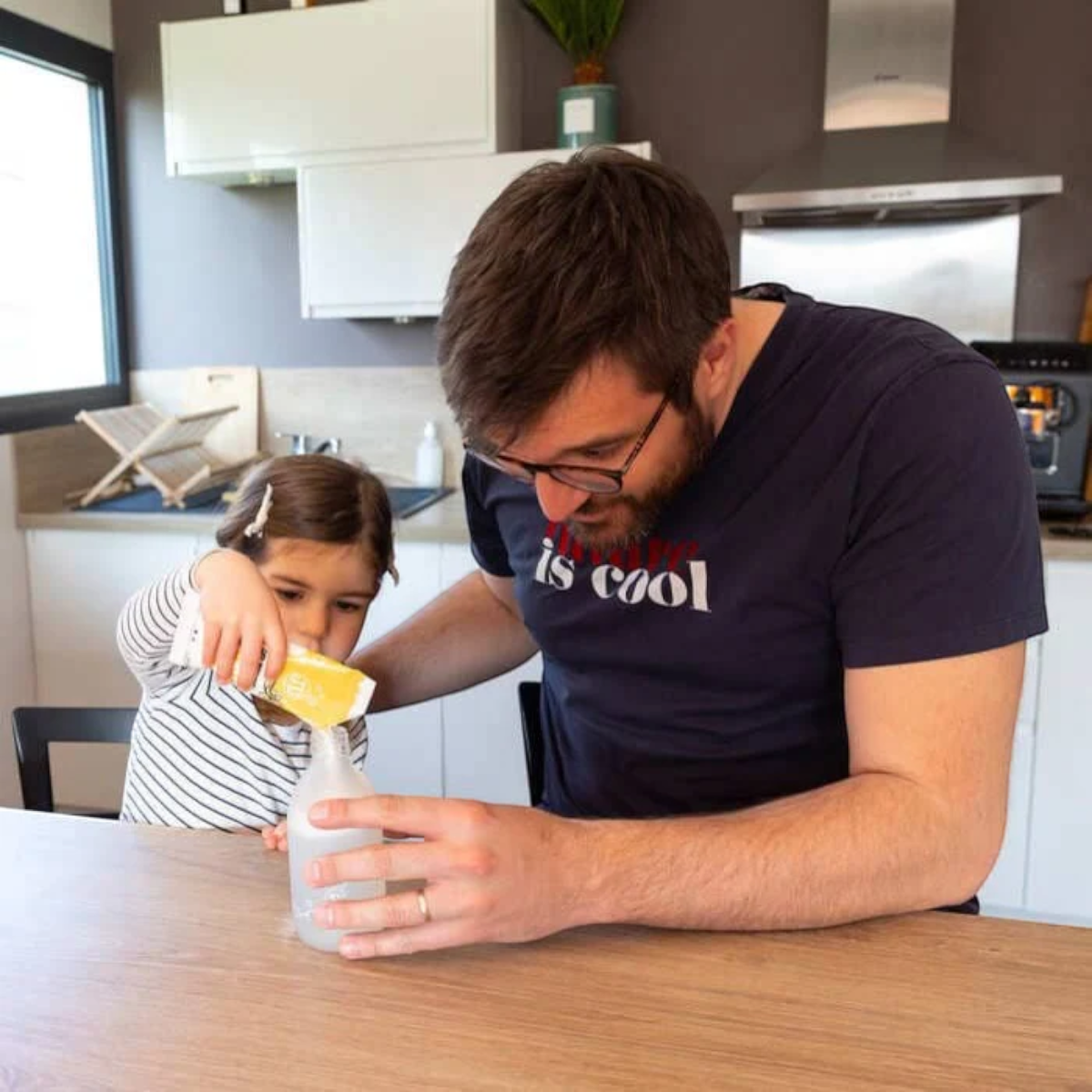 Versez 225mL d’eau tiède dans un flacon pompe (jusqu’à la bulle blanche si vous utilisez la bouteille gel douche Pimpant), puis ajoutez le sachet de poudre. Refermez et secouez énergiquement pendant quelques secondes pour obtenir un gel homogène. Laissez reposer 20 minutes afin que la texture se stabilise. Vous pouvez ensuite vous laver le corps avec votre nouveau gel douche !
