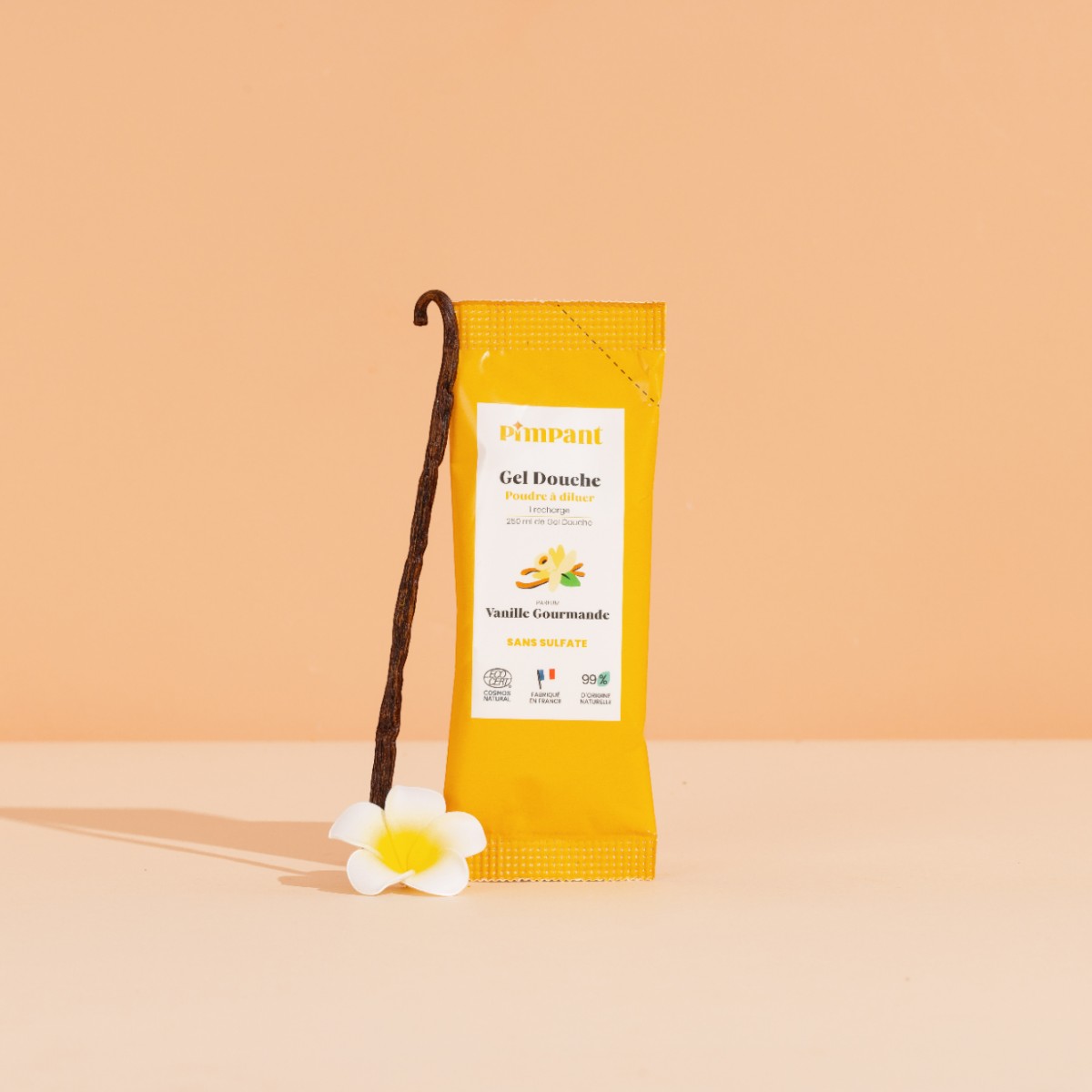 Le Gel Douche Vanille Gourmande Pimpant nettoie la peau en douceur et convient aux peaux normales ou sensibles.
