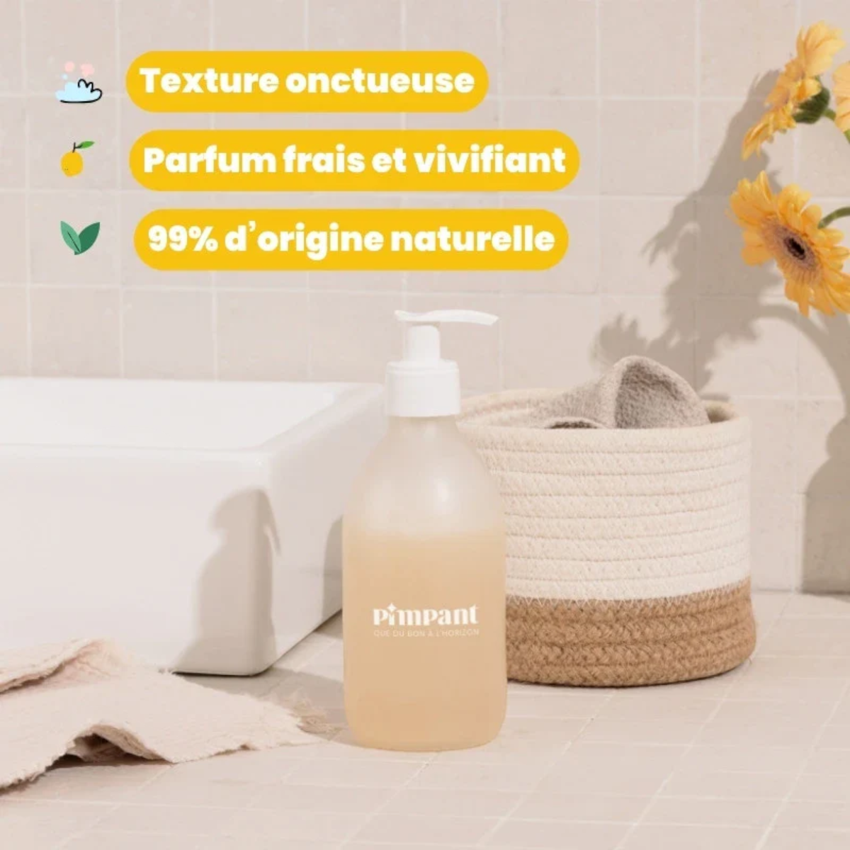 • Tensioactifs doux, parfum d’origine naturelle, pH respectueux de la barrière cutanée