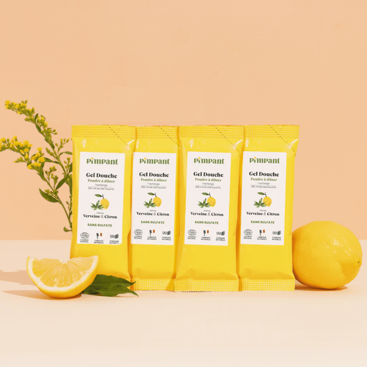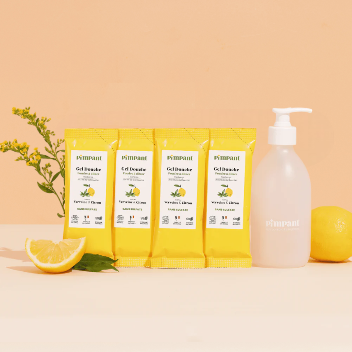 Versez 225mL d’eau tiède dans un flacon pompe (jusqu’à la bulle blanche si vous utilisez la bouteille gel douche Pimpant), puis ajoutez le sachet de poudre. Refermez et secouez énergiquement pendant quelques secondes pour obtenir un gel homogène. Laissez reposer 20 minutes afin que la texture se stabilise. Vous pouvez ensuite vous laver le corps avec votre nouveau gel douche !