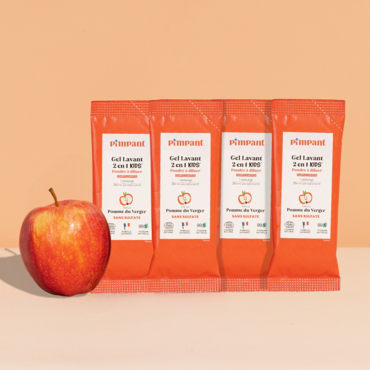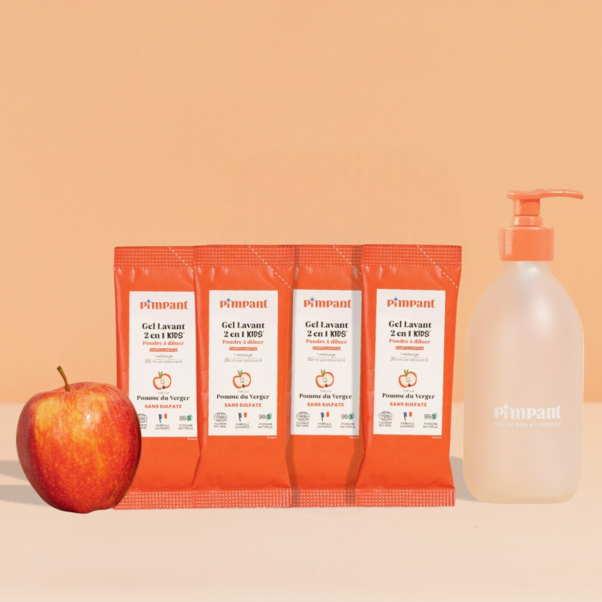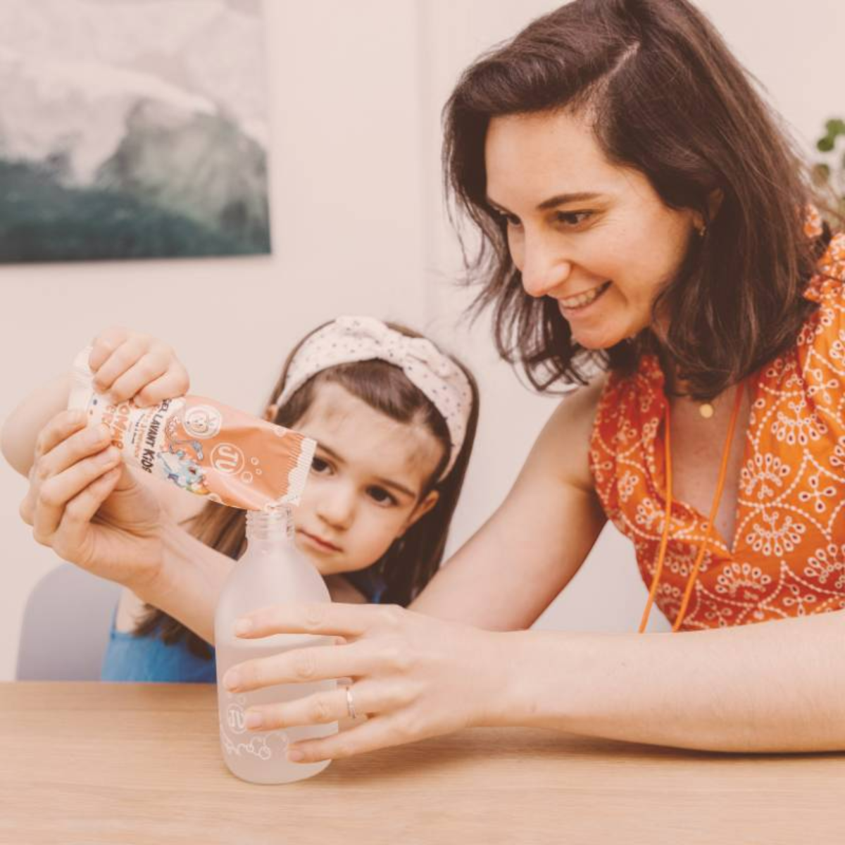 Versez 225mL d’eau tiède dans un flacon pompe (jusqu’à la bulle blanche si vous utilisez la bouteille gel douche kids Pimpant), puis ajoutez le sachet de poudre. Refermez et secouez énergiquement pendant quelques secondes pour obtenir un gel homogène. Laissez reposer 20 minutes afin que la texture se stabilise. Vous pouvez ensuite laver le corps et les cheveux de votre enfant avec votre nouveau gel douche ! Evitez tout contact avec les yeux. En cas de contact, rincez immédiatement et abondamment à l’eau froide.