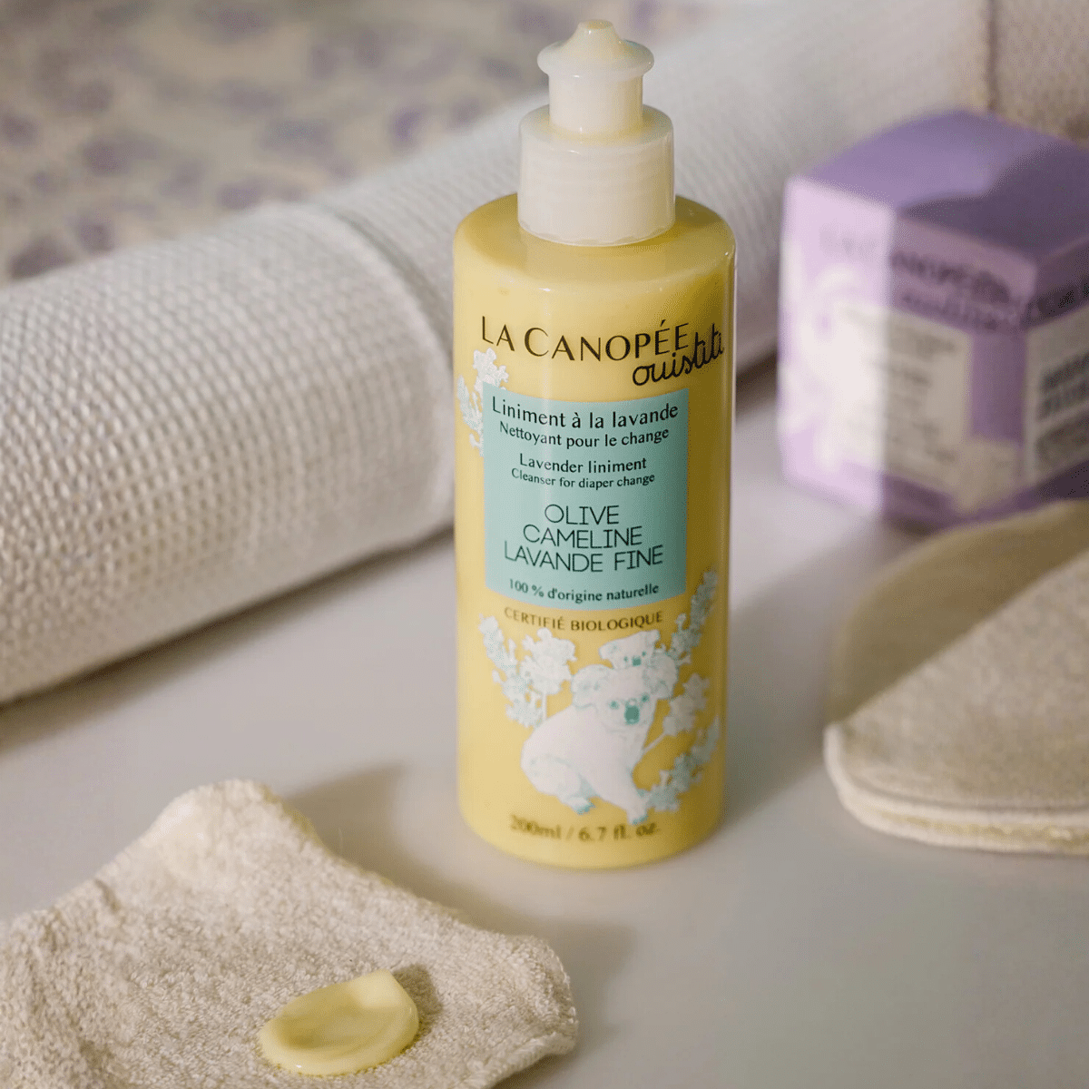Le Liniment à la Lavande La Canopée est un soin nettoyant, apaisant et protecteur, spécialement formulé pour préserver la peau délicate des bébés.