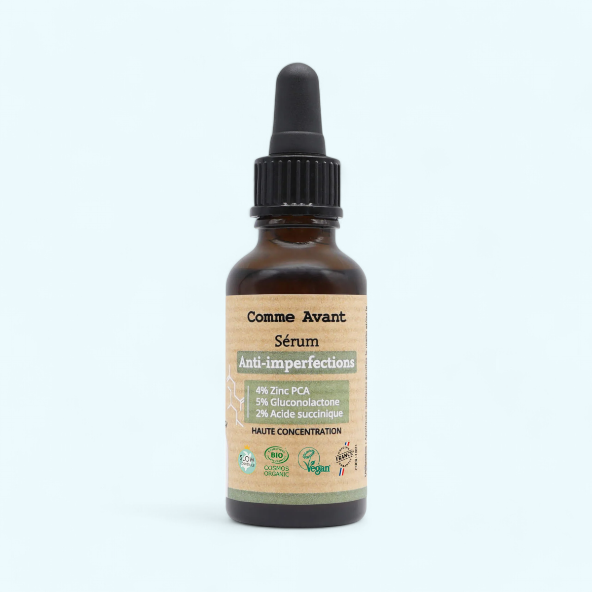 Le Sérum visage anti-imperfections Comme Avant est un soin aqueux fluide et concentré, formulé pour purifier la peau, affiner le grain et réduire l’apparition des boutons des peaux mixtes et grasses.