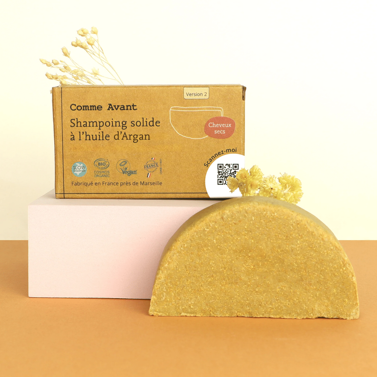 Le shampoing solide bio à l’huile d’argan Comme Avant est spécialement formulé pour nettoyer en douceur les cheveux secs, cassants ou abîmés.